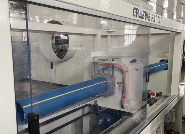 Po czwarte, rura jest wciągana przez zespół trakcyjny gąsienicowy i kierowana do przecinarki, gdzie rura jest obcinana na zadaną długość; jednocześnie pył po cięciu jest usuwany przez odpylacz.